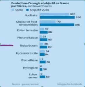 Production d’énergie et objectif – En premier décryptage, nous pouvons nous intéresser à la place faite à la biomasse et au bois ligneux, au sein des énergies et de la priorisation des usages. Un visuel compare la projection de répartition par filière en térawattheures, de 2023 à 2035 : les attentes en biocarburant sont ici doublées, tout comme le chauffage et l’électricité (on notera, pour les sources de production, notamment la stagnation de l’hydroélectricité, tandis que montent biométhane et photovoltaïque; et considéré par l’UE comme renouvelable le nucléaire a le vent en poupe, mais nécessitant de nouvelles structures la production ne peut être immédiate).