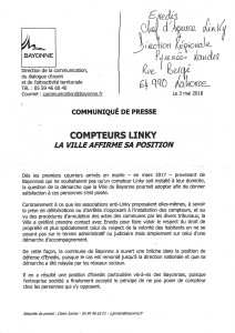 La Mairie de Bayonne a, tout d’abord, publié un Communiqué de presse concernant la possibilité pour ses administrés de refuser la pose du compteur Linky. A suivi une conférence de presse (voir vidéo plus bas).