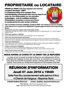 – A BAYONNE – Information organisée par Stop Linky Bayonne jeudi prochain 07 juin, à 19H: Salle Paul Bru, 4 chemin de Hargous, Bayonne Nord.