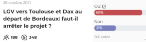 Un point sur le sondage du journal: 566 votes, soit 69% pour arrêter le projet contre 31% pro LGV du GPSO. Bonne mobilisation des opposants!