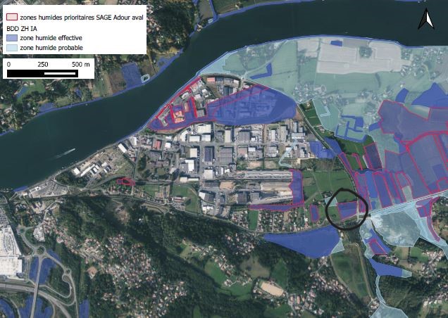 Le dépôt du permis d’aménager a enclenché une procédure de « participation du public par voie électronique » (PPVE) qui s’est tenue au mois de décembre. Nous nous sommes rendus compte après coup qu’une information fondamentale n’avait pas été mise à la disposition du public : le site comporte sur 1,3 hectares une zone humide classée « prioritaire »1 dans le SAGE (Schéma d’Aménagement et de Gestion des Eaux ) Adour aval. Or la destruction de ces zones humides prioritaires est totalement interdite2. Il n’y pas de notion de compensation possible hors cas très particuliers qui ne concernent pas Enovis. L’installation d’Enovis à cet endroit est donc tout simplement impossible.L’association Mouguerre Cadre de Vie a écrit au Maire de Mouguerre dans le cadre d’un recours gracieux pour qu’il retire son autorisation sur ce permis d’aménager, ce qu’il peut faire jusqu’au 30 avril 2024. Le CADE s’apprête à déposer un recours contentieux qui permettra de faire stopper les travaux s’ils démarraient. Ce recours relève bien sûr l’impossibilité de toucher à la zone humide prioritaire et d’autres points qui concernent également Enovis, notamment le fait que le préfet a limité la dérogation de destruction des habitats des espèces protégées aux seuls projets ferroviaires.