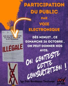 Laisser faire cette consultation à la place d’une réelle enquête environnementale, c’est donner un coup d’accélérateur au projet. Avec cette étape, cela donne le pouvoir aux préfets de déposer leurs arrêtés d’autorisation de commencer les investigations sur le terrain dès 4 jours à partir de la clôture…Qui veut voir arriver les bulldozers le 1er décembre dans la vallée du Ciron et ailleurs ?!