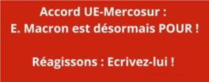 Sur le lien de la lettre ouverte, une action électronique très simple à exécuter vous est proposée : Bloquons l’accord UE-Mercosur : interpellez E. Macron & les députés européens – Collectif Stop TAFTA – Non au Grand Marché Transatlantique . ALLEZ, ON COMPTE SUR VOUS !