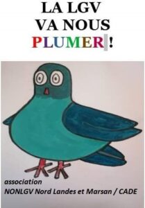 Même si le CADE et l’association Non LGV Nord landes et Marsan souhaitent, de leur côté, l’arrêt de ce projet inutile, destructeur et ruineux, il faut dès à présent, faire voter par nos élus un moratoire sur tout versement d’annuité, tant qu’un nouveau plan de financement réaliste, complet, sincère, n’aura pas été soumis à leur approbation. Il y va de la qualité de vie et de la cohésion sociale dans le département des Landes!