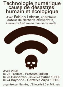 La série de conférences sera donnée par Fabien Lebrun. Éditeur et chercheur indépendant, il est notamment l’auteur de « On achève bien les enfants. Écrans et destructivité numérique » (Le Bord de l’eau, 2020) et de « Barbarie numérique. Une autre histoire du monde connecté » (L’Échappée, 2024, adapté de sa seconde thèse).